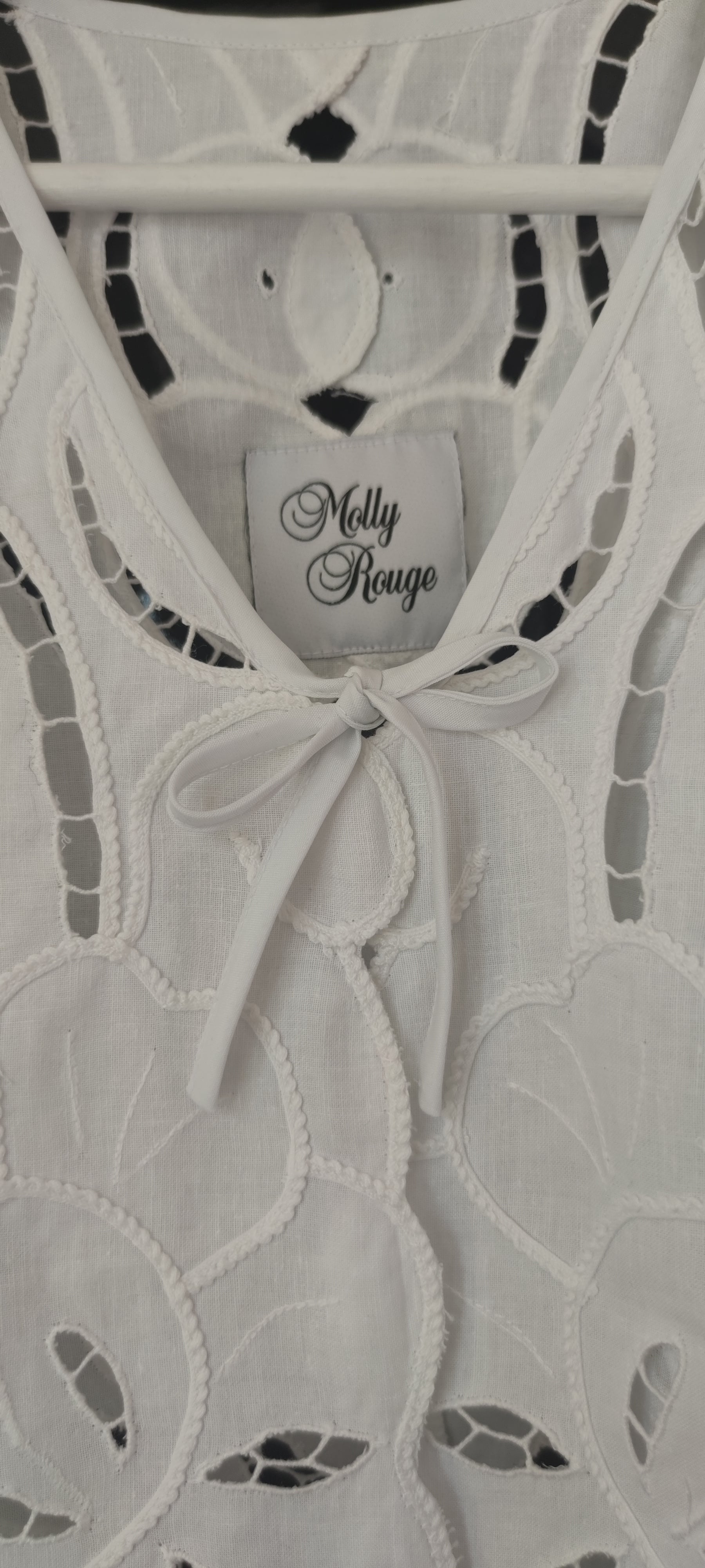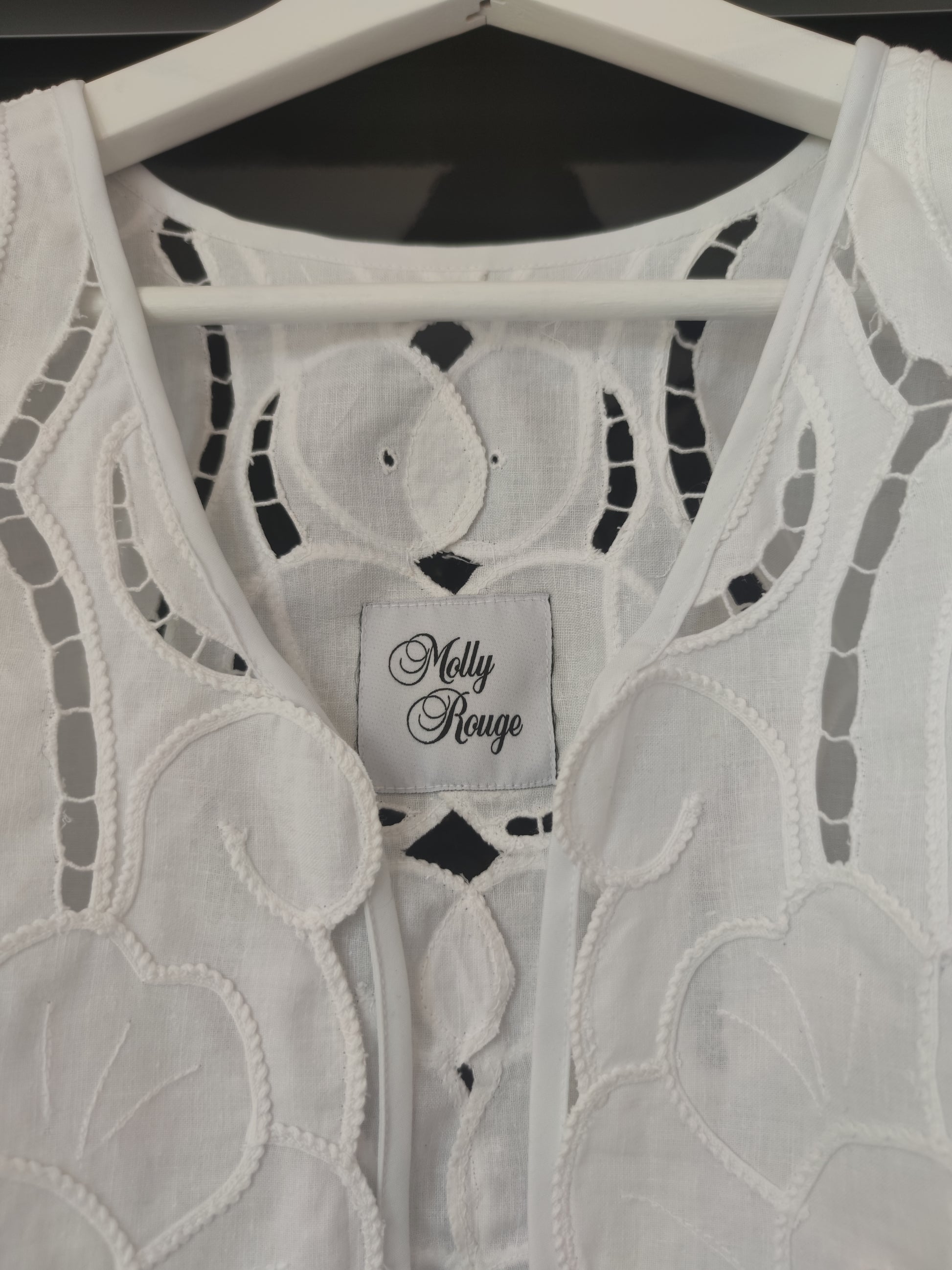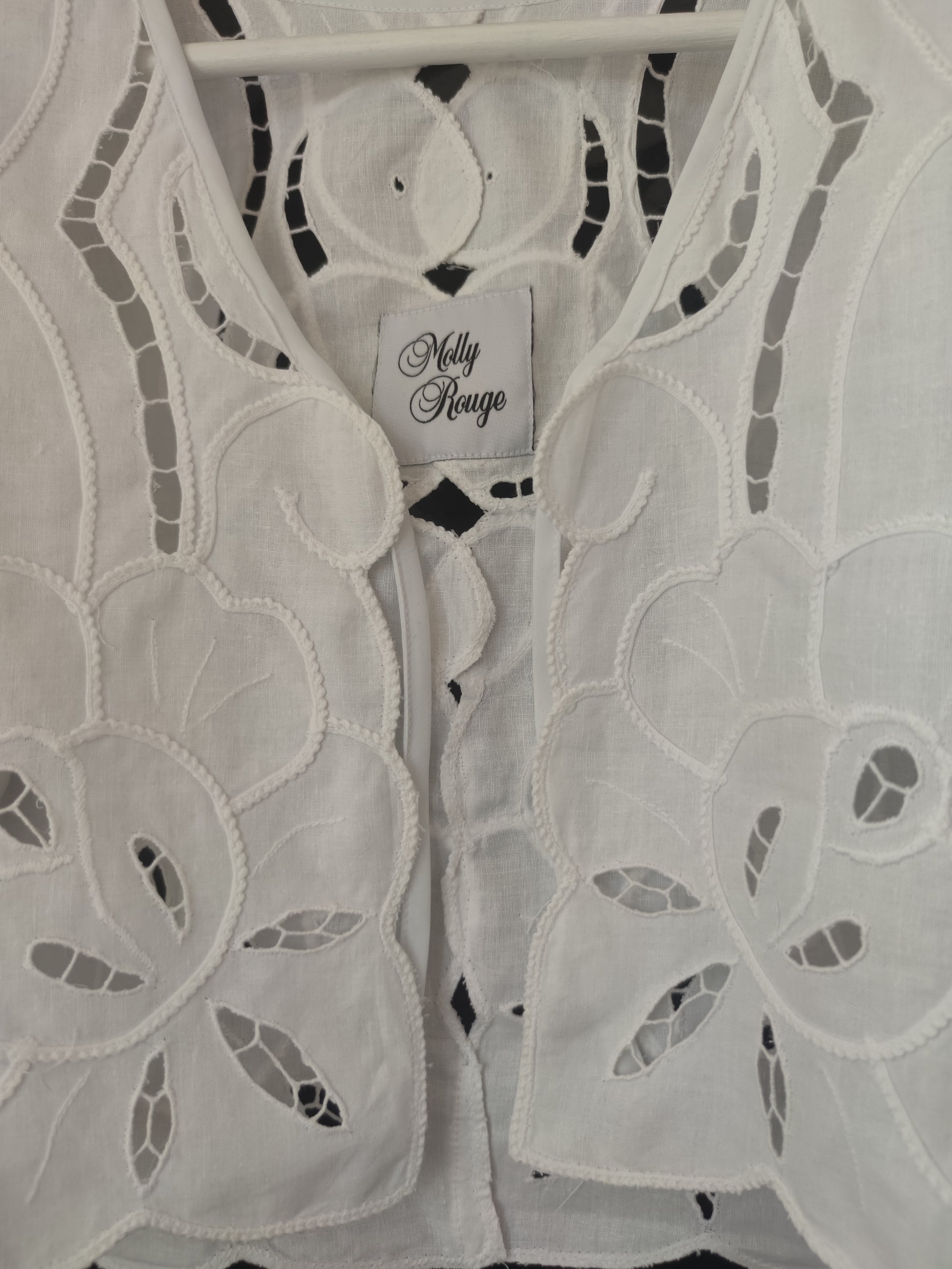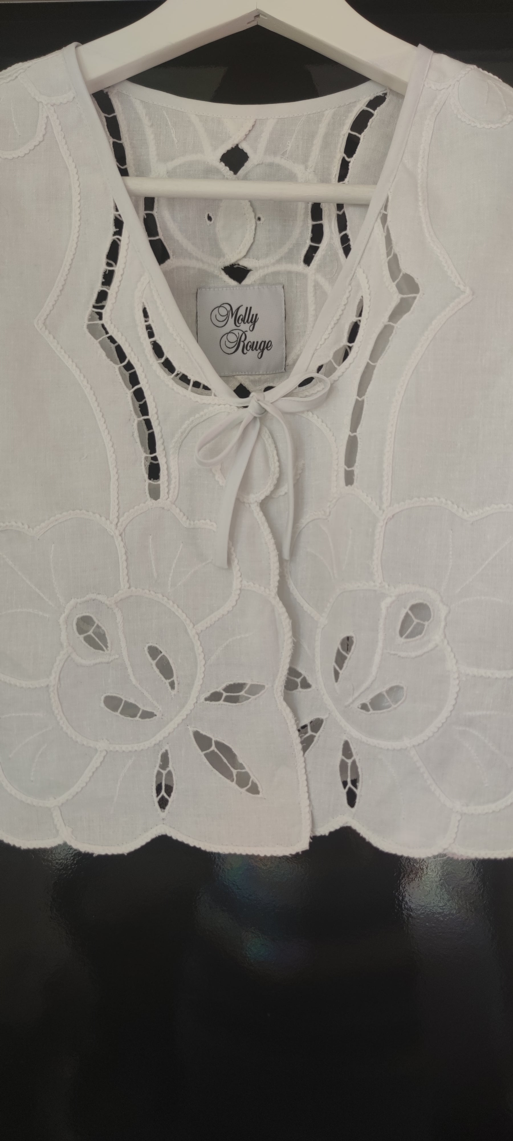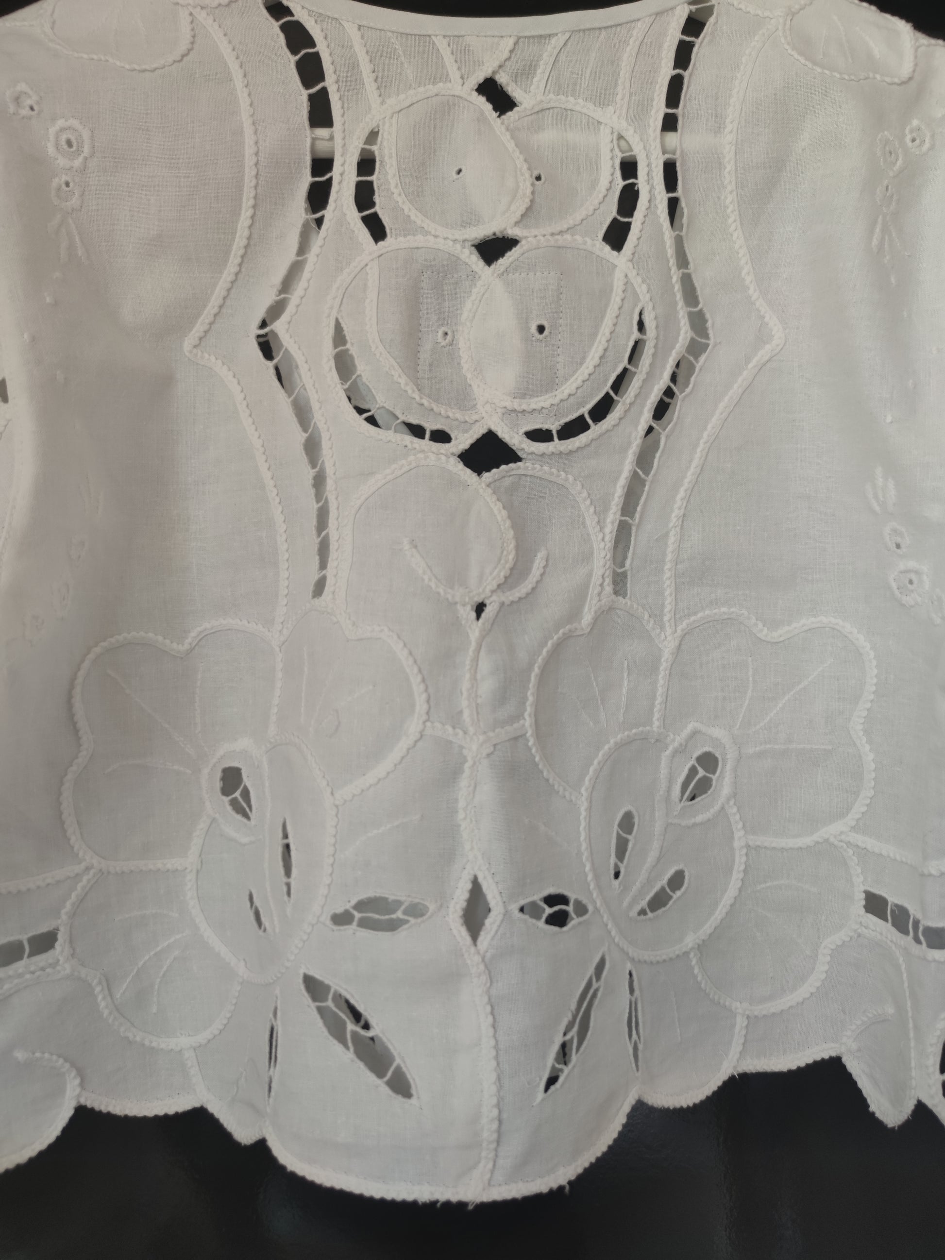 Beautiful details: white work embroidery, tape appliqué and cut out sections, with floral design.