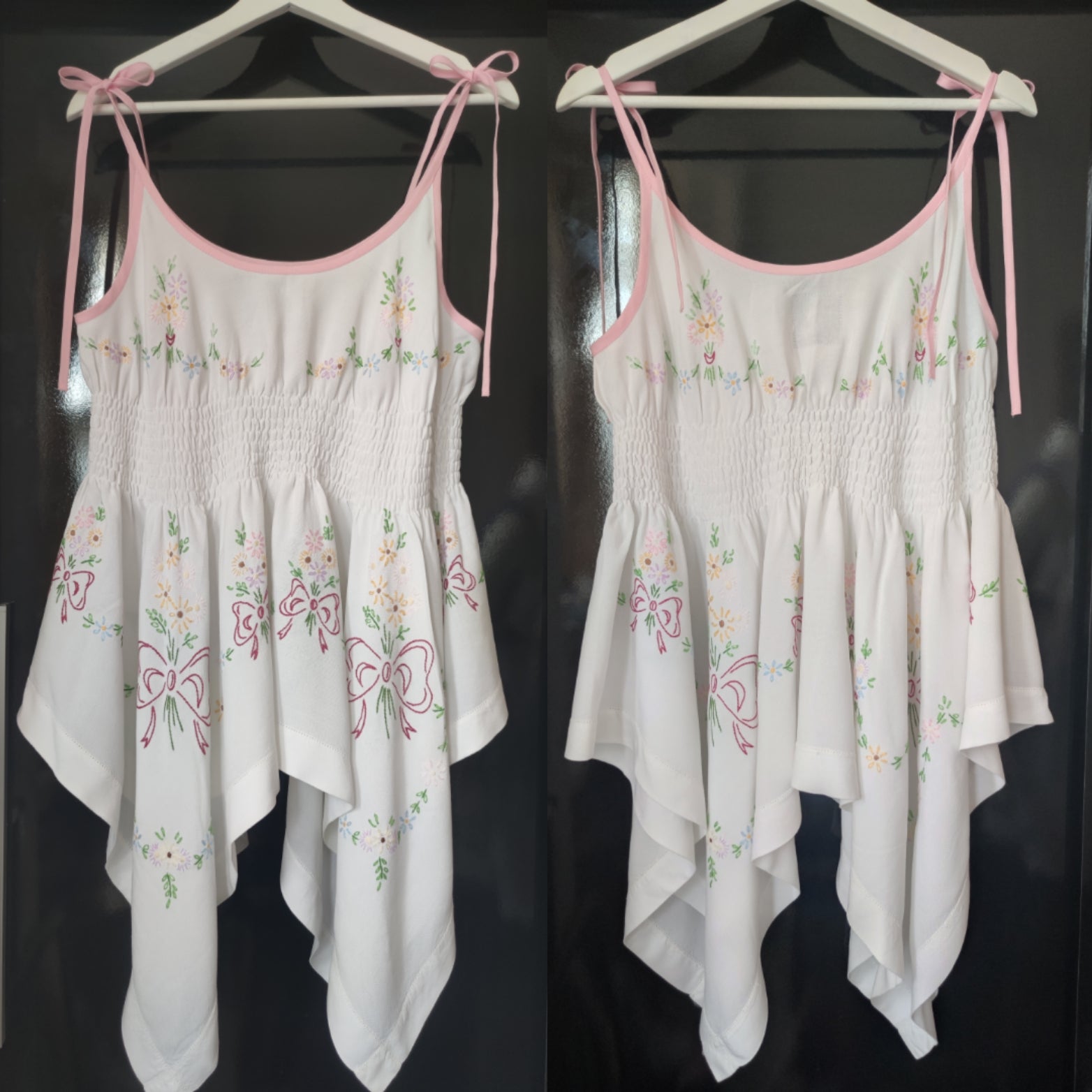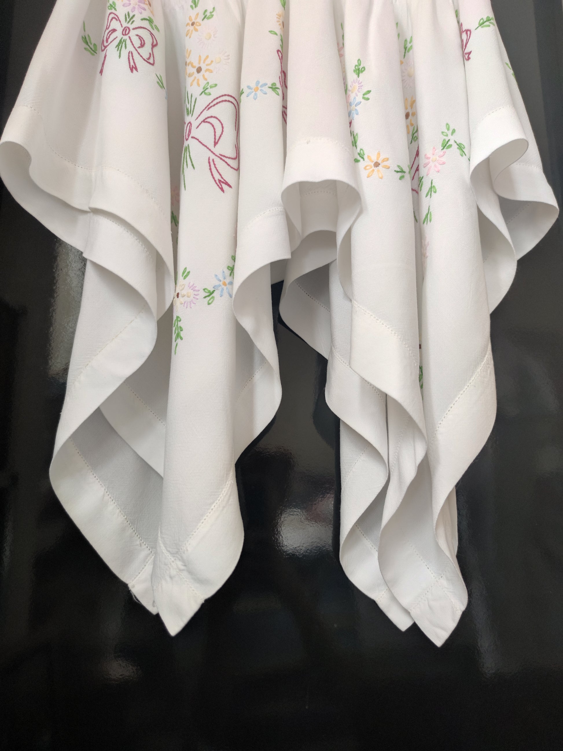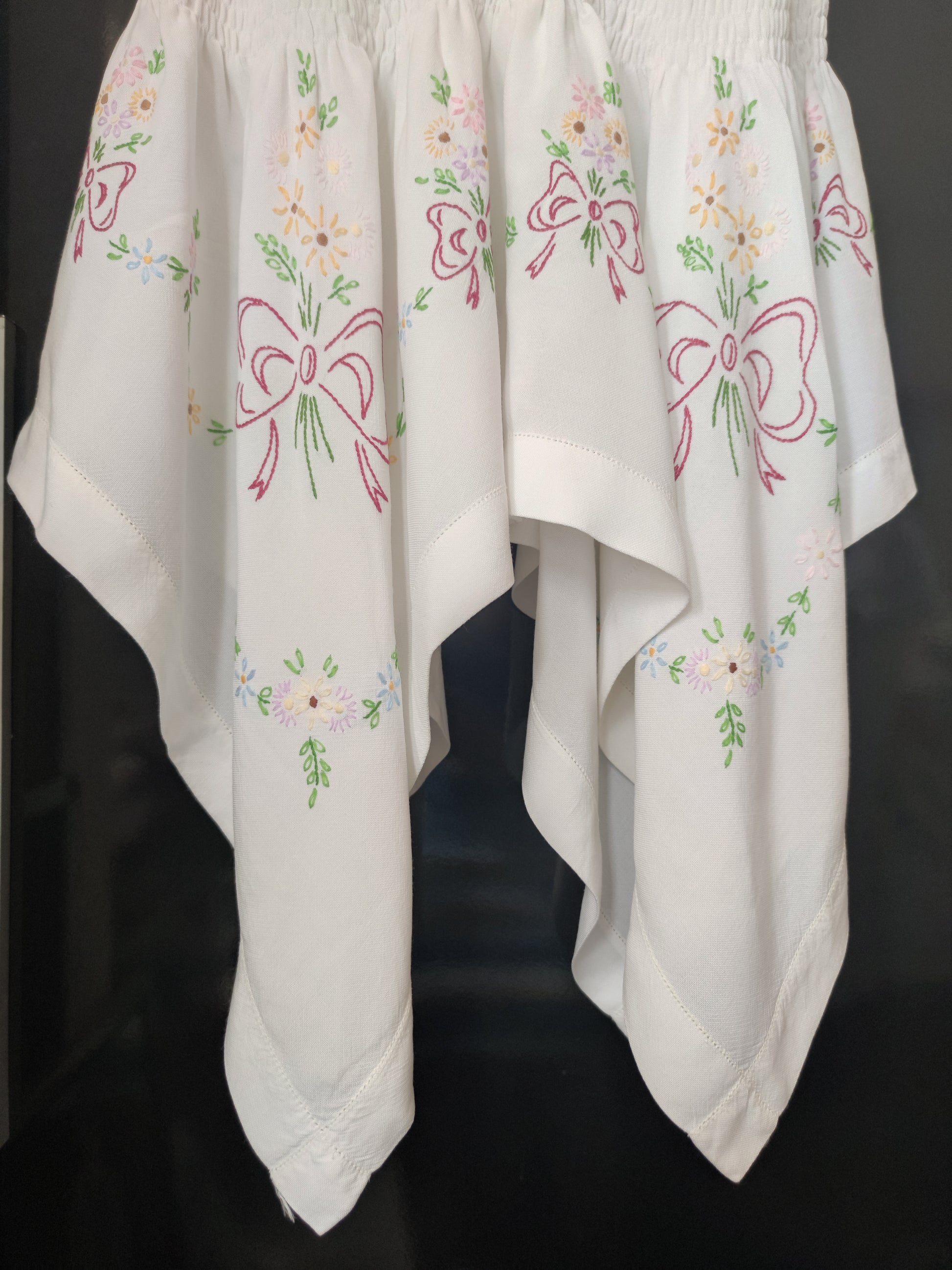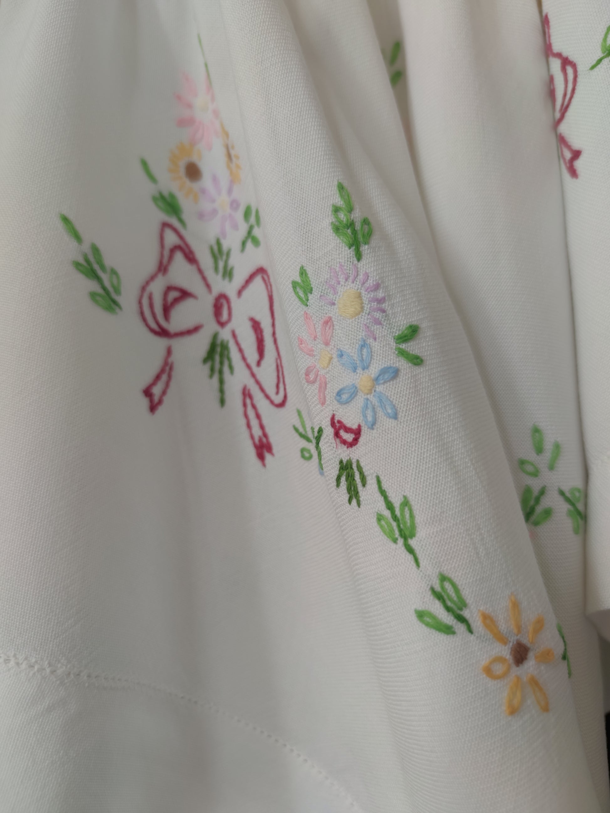 Made from a vintage rayon table cloth featuring hand embroidered bows and flowers stitched in cotton.