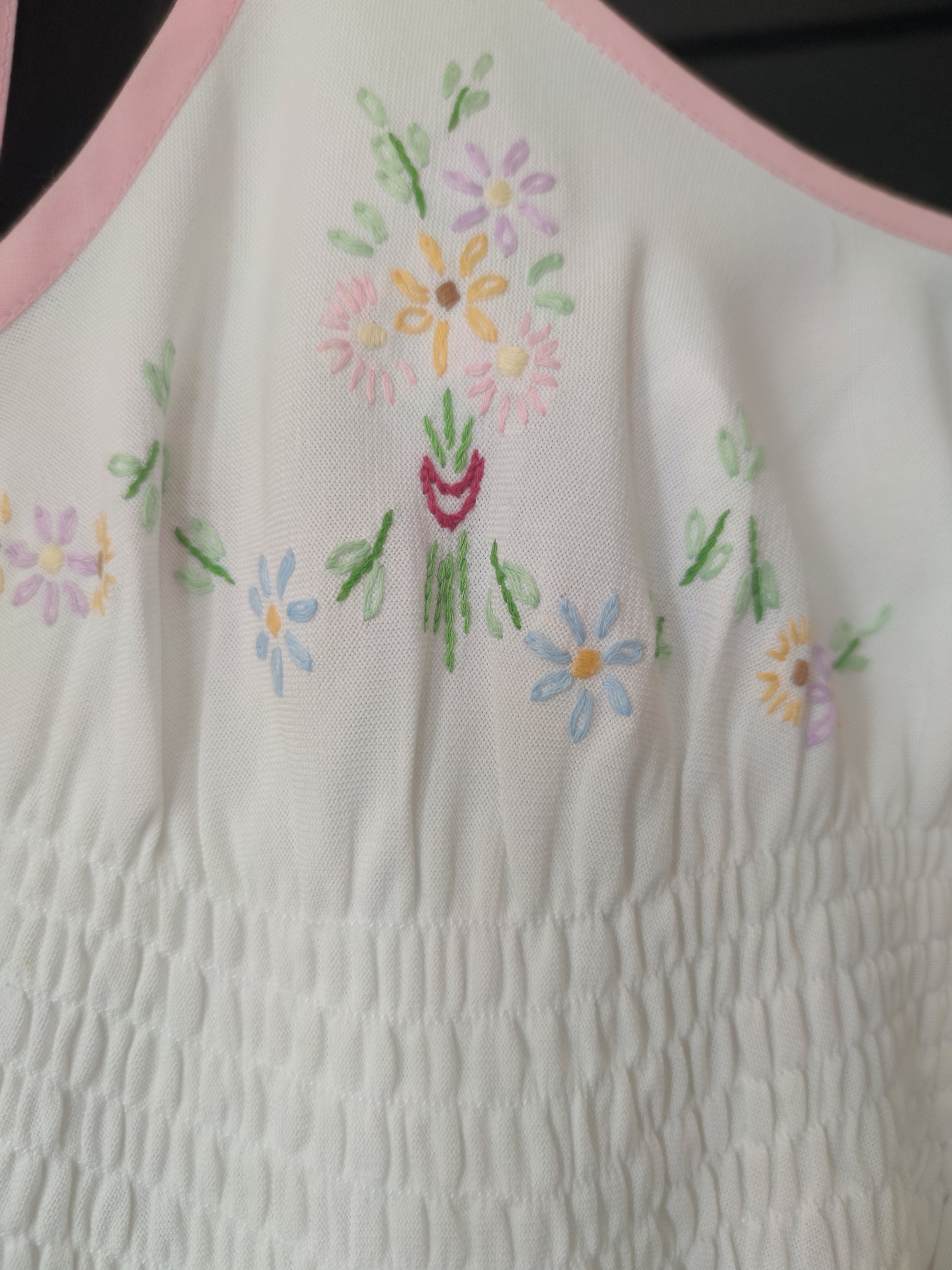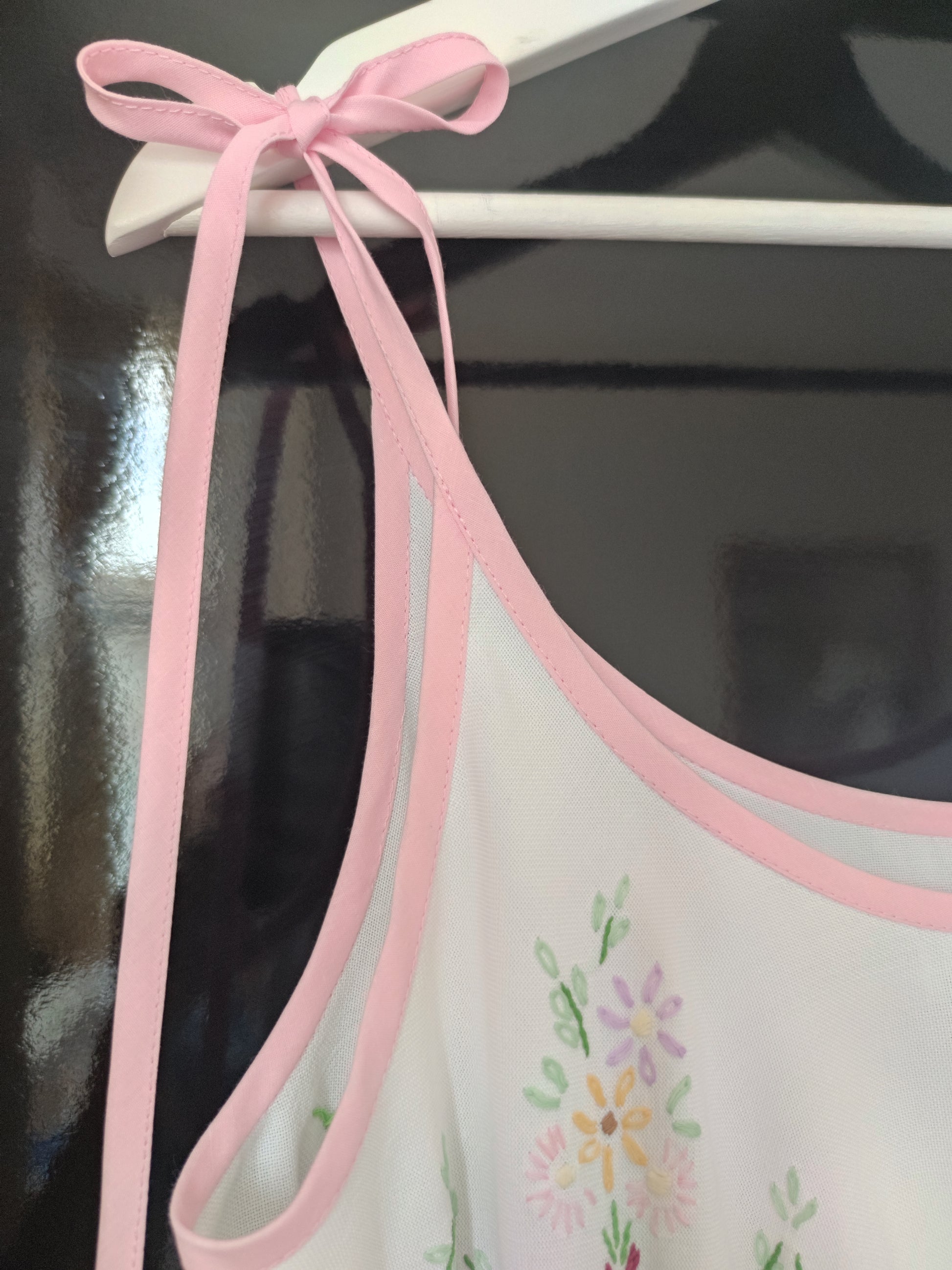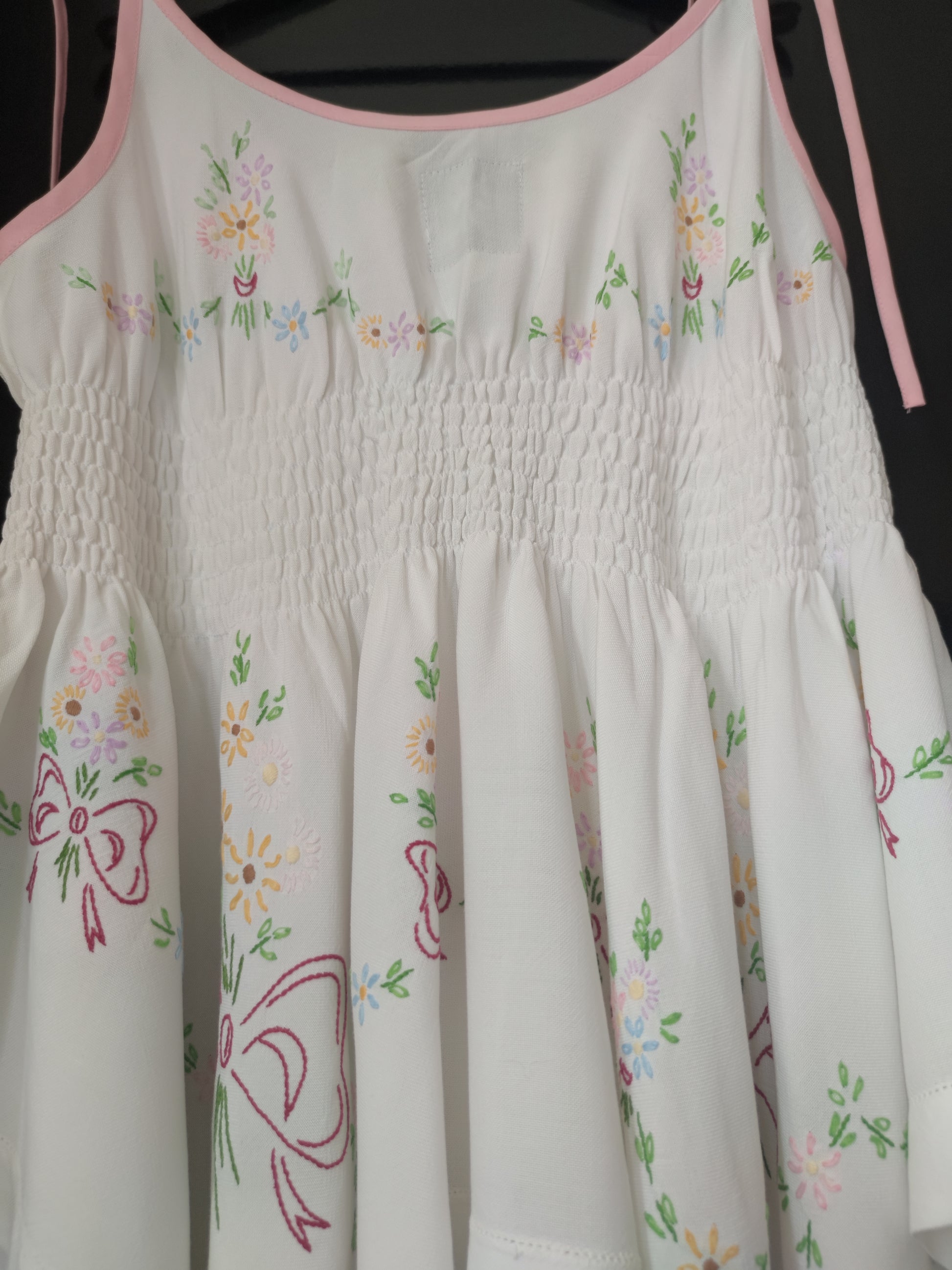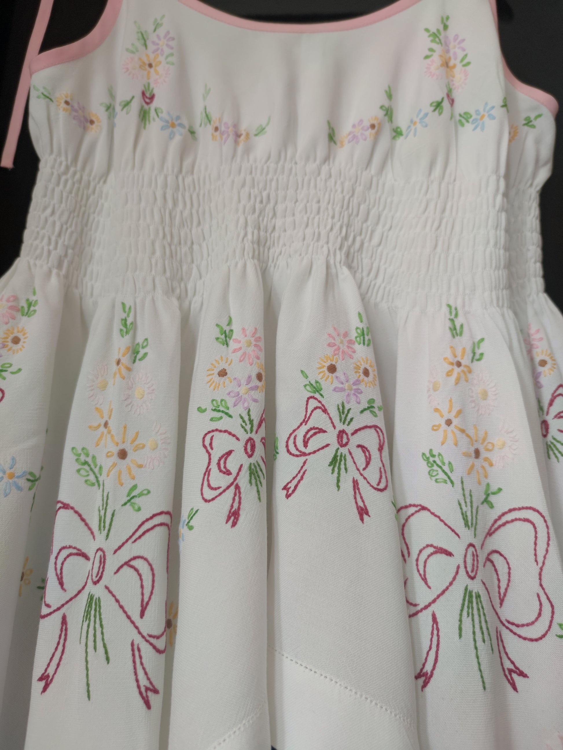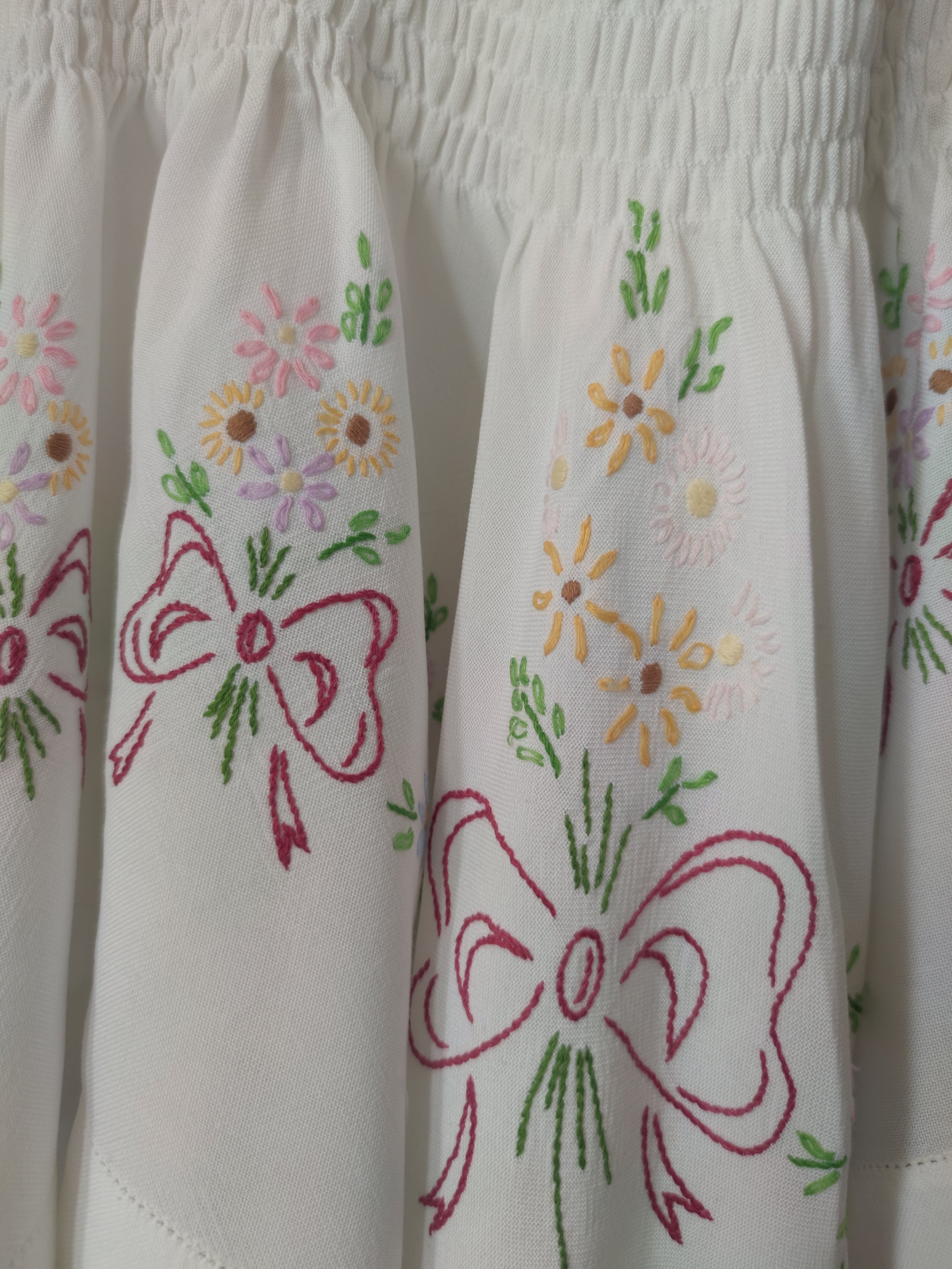 Made from a vintage rayon table cloth featuring hand embroidered bows and flowers stitched in cotton.